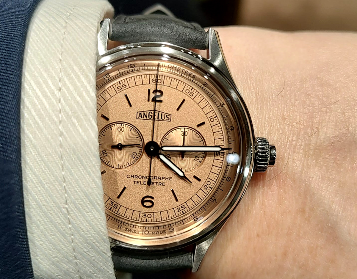 Au sein du même groupe, nous en avons profités pour admirer LA nouveauté Angelus, à savoir les trois versions du Chronographe Télémètre Steel, Yelow gold, grey et rose. Sublimement vintage dans sa forme, son diamètre de 37mm, et ses fonctions, chronographe mono-poussoir et télémètre 20km, elle se veut résolument performante par son mouvement manuel A5000 doté d’une roue à colonnes et embrayage horizontal battant à 3Hz et offrant 42 heures de réserve de marche, richement décoré et visible par un fond fermé d’un verre saphir.