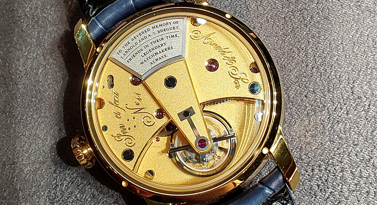 Pour terminer, notons le fond transparent, ouvrant sur ce mouvement dont l’esthétique est inspirée du dos de l’instrument de mesure du temps originel conservé au British Museum. Sur le pont de barillet grené et anglé, on retrouve d’ailleurs les inscriptions gravées-main, la fameuse plaque sur laquelle a été inscrit un nouveau texte inspiré de l’original : « To the revered memory of John Arnold and Abraham-Louis Breguet. Friends in their time, legendary watchmakers always. » (A la mémoire révérée de John Arnold et Abraham-Louis Breguet. Amis en leur temps, horlogers de légende pour toujours).