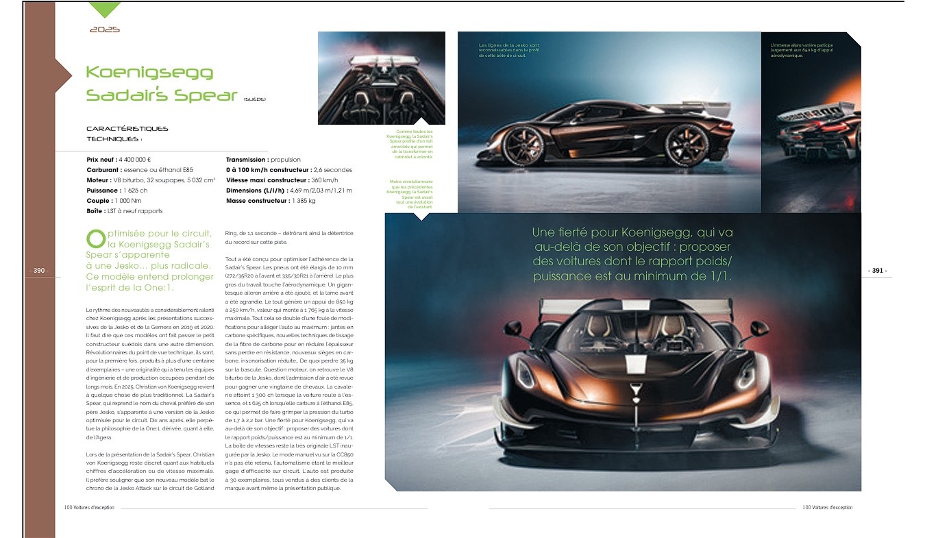Il est de retour ! Apres une belle édition 2023, l’ouvrage nous revient deux ans plus tard sous le même titre : 100 voitures d’exception. Lamborghini, Ferrari, Aston Martin, Bugatti et autre Porsche ont de tout temps conçu des voitures qui ont fait rêver les passionnés d’automobiles. Mais, au sommet de leur production standardisée, il existe une gamme de modèles fabriqués en séries très limitées et destinés à franchir tous les records sur piste ou sur route. Au-delà de leur prix de vente étourdissant, ces joyaux de technologie et de design, baptisés « Valkyrie », « Agera » ou encore « Chiron », se distinguent par des innovations techniques qui dépassent l’entendement. Amateurs de sports mécaniques, bienvenue à bord de ces fascinants bolides pour découvrir les performances et les secrets de production de ces modèles d’exception, apparus entre 2005 et 2025, de la Bugatti Veyron à la Koenigsegg Sadair’s Spear.