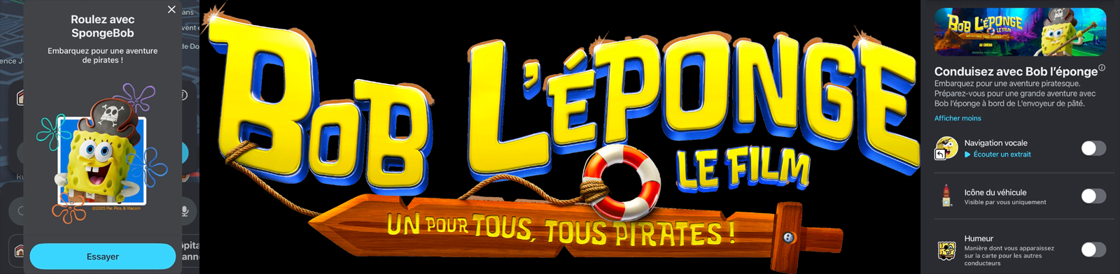 En effet l’éponge la plus célèbre du monde devient votre nouveau copilote pour une aventure piratesque ! Pour célébrer la sortie prochaine du film BOB L’ÉPONGE - LE FILM : UN POUR TOUS, TOUS PIRATES ! , au cinéma le 24 décembre, Bob l’éponge met son humour incomparable et sa bonne énergie au service de vos trajets sur l’application de guidage star, Waze.